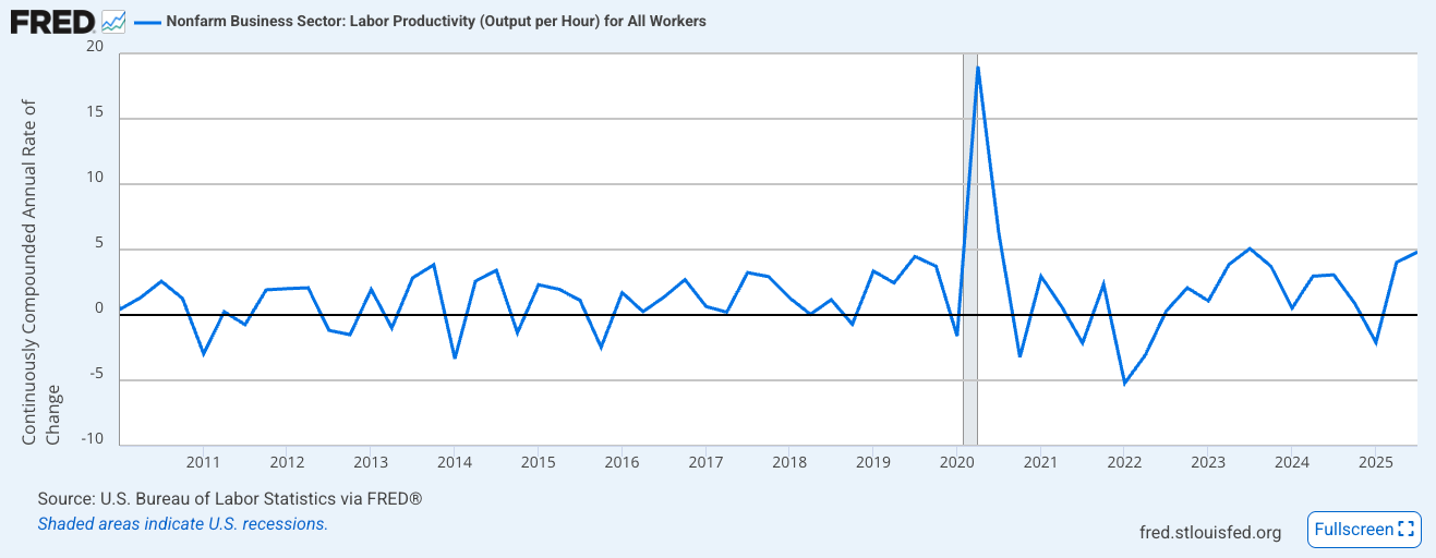 He cautioned, though, that it would take a while for AI’s productivity benefits to appear in the productivity statistics. Those stats might even take a dip for a while because reconfiguring organizations to take advantage of general-purpose technologies is hard work requiring a lot of investment.3 But to paraphrase Erik paraphrasing Sam and Dave, “Hold on, they’re coming.” (“they” being 2020s productivity growth numbers averaging 1.8%). As he wrote in the FT: